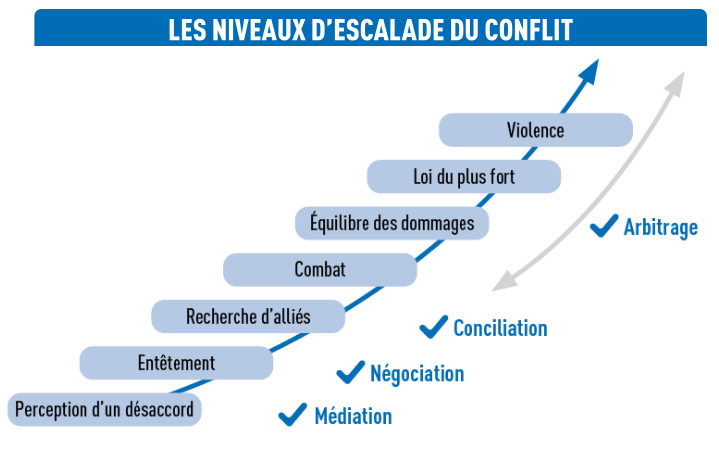 • Identifier le niveau du conflit en cours.• Au niveau de la perception d’un désaccord, avoir recours à une médiation.